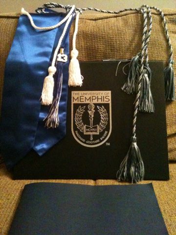 But the world didn’t end and May 12th, 2013 (G-Day) arrived. My family was there to support me and tease me (I still think my Dad was the loudest one in there). I joked and laughed with the fellow graduates sitting close to me. I watched as each student was announced and walked across the stage to receive the book their diploma would later be slipped into (we actually get them in the mail). I saw friends receive their doctorate degrees, their master degrees, their undergraduate degrees – all the faces that had become so familiar to me over the last few years. By the time my turn came, I was a bundle of nerves, the noise inside the Fedex Forum completely muted. I handed my name card to the assistant who passed it on to the announcer who called my name and I walked across the stage to shake the hand of the first female University of Memphis President, Shirley Raines. I made it the rest of the way across without tripping over my feet and floated on air back to my seat. The noise volume in the Forum went back up. I had done it. Four years of studying, stressing, researching, and reading all led up to the moment that went by in seconds. I was a Pannell college graduate, graduating with cum laude honors. The first one in our immediate family.