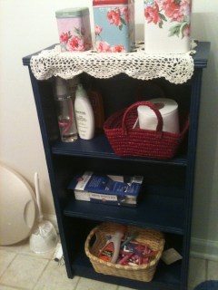 Back when I first got divorced, an old friend picked up a slightly used bookcase at a yard sale. It had obviously been used in a child’s bedroom, but it was the perfect size for my bathroom at the time. Later, it was a great fit in the small bathroom of my townhouse on the UofM South Campus.