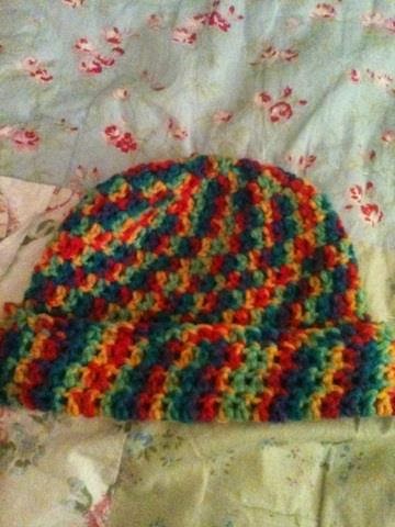 I used some yarn given to me, Baby Bee Sweet Delight Crayons Ombre. I love how it makes a pattern when you crochet it! Here is the pattern for the hat: Crocheted Baby Hat by Hooked on Needles. These can be made up in about a couple of hours so they make great quickie gifts!