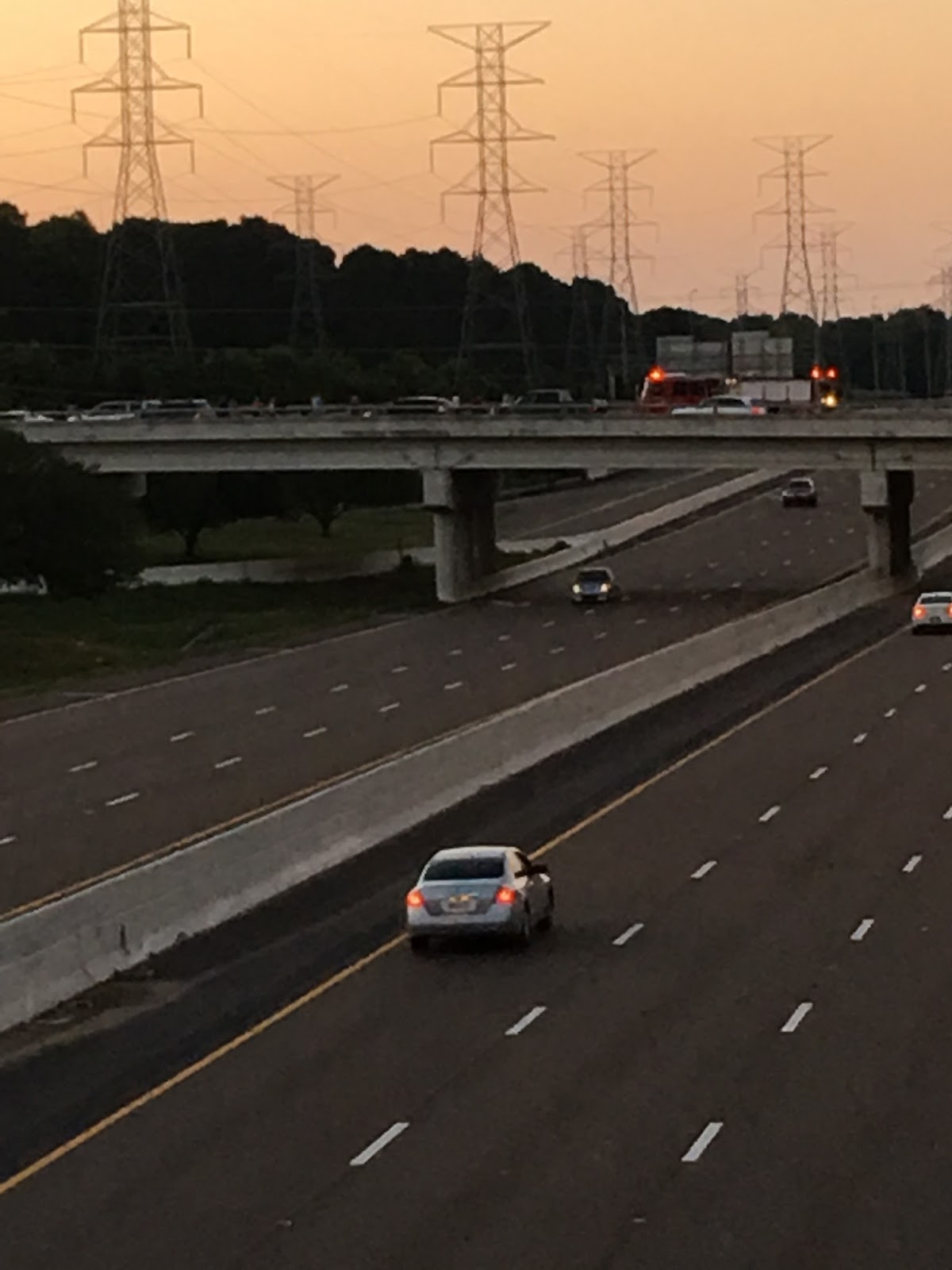Yesterday, Memphis paid tribute to fallen Officer Verdell Smith. Bryan and I got a chance to see the Sea of Blue drive from Hope Pres to the downtown precinct last night. We were driving eastbound on Poplar Ave when we saw a firetruck and a few cars pulled over. We circled around and parked. Bryan backed the car in while I talked briefly with a fireman. We agreed that while it was sad to have to have a Sea of Blue, it was very touching to see so many Memphians support the police officers. We waited silently as the sun peacefully set over the Memphis horizon. The folks who had pulled over were watching, their patience giving a hint at what were about to witness. Southbound traffic on I-240 had almost stopped minus a few stragglers while northbound traffic had started slowing down. We could see everyone who had begun to stop on the westbound side on Poplar Ave on the bridge: